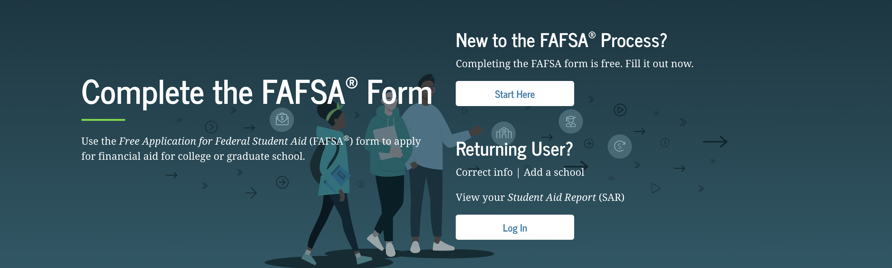 To begin the application as a new user, your student should select the "Start Here" button on the FAFSA homepage. If your student is a returning user and filling out a new application for the year, your student should select "Log In" button on the FAFSA homepage.